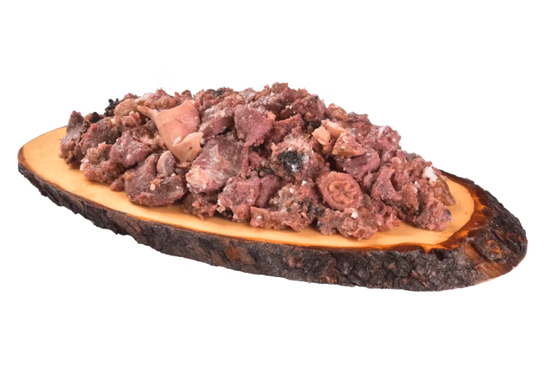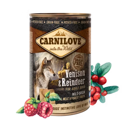 hjortkött (47 %), ren (20 %), blåbär (2 %), lingon (2 %), hallon (2 %), ärtmjöl (2 %), lignocellulosa (1 %), laxolja ( 0,5 %)