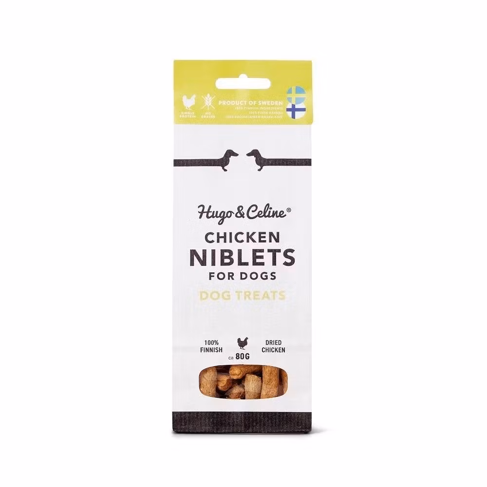 Hundgodis - belöningsgodis av kycklingkött från norden. Välsmakande godbitar som passar till både träning & belöning (även till den kräsna hunden). Naturliga, spannmålsfria godbitar som sätter guldkant på vardagen. Godiset är enkelt att bryta i småbitar, perfekt för dig som har en liten hund. Hugo & Celine Chicken Niblets