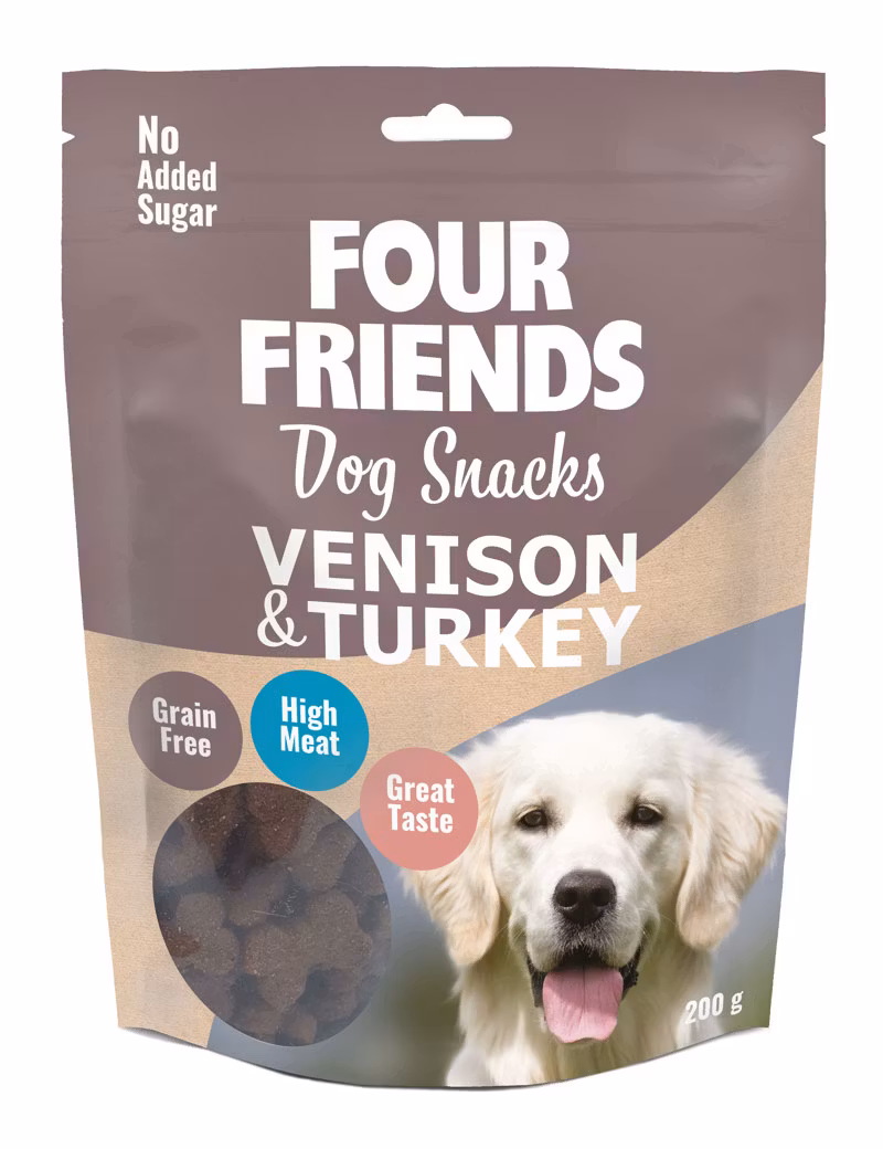 Nu kan du belöna din hund med nyttigt godis som samtidigt boostar din hunds hälsa. Hjort och kalkon är källa till lättsmält protein som även passar känsliga hundar och självklart är det spannmålsfria godbitar. De är fullproppade med naturliga antioxidanter som skyddar cellerna och ett pH-neutralt C-vitamin som stärker immunförsvaret. Rosmarinextrakt stimulerar matsmältningen och godiset är rik på nyttiga omegafettsyror som bidrar till frisk hud och blank päls. I detta godis har vi tillsatt tranbär.