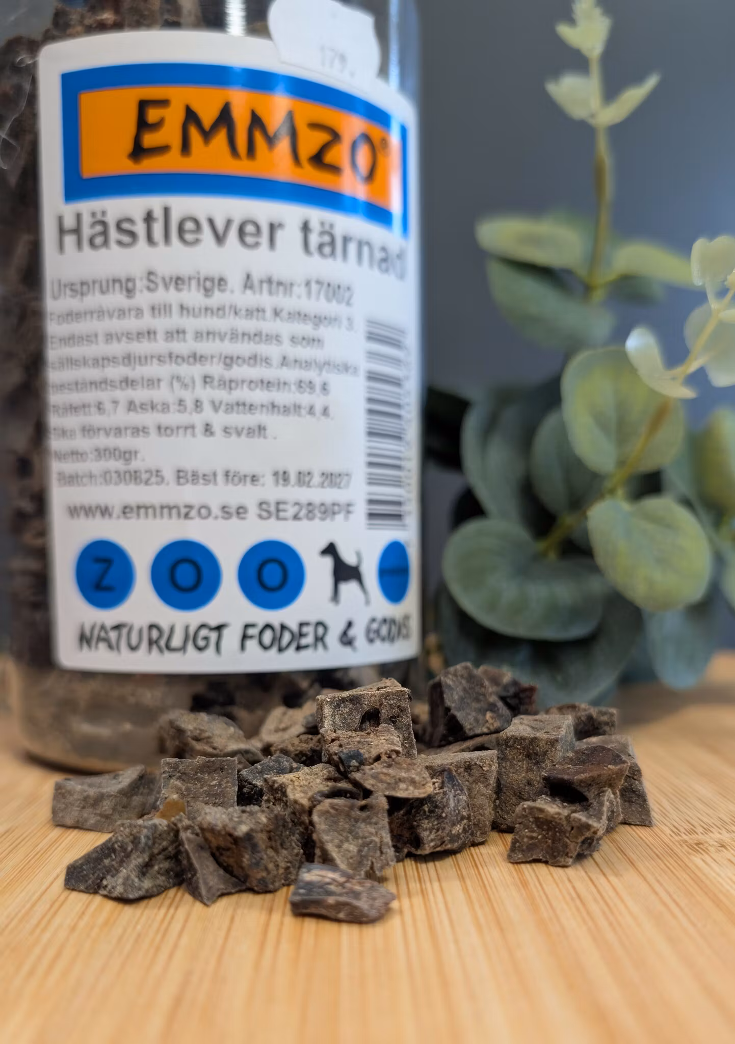 Emmzos tärnade hästlever är ett smakrikt och näringsrikt hundgodis gjort av 100% svensk råvara. Bitarna är krispiga, varierar i storlek från cirka 0,5x0,5cm till 1x1cm och är svåra att delar. Lever är naturligt rikt på vitaminer och mineraler - ett smart komplement i vardagen, men som alltid ska ges med måtta.